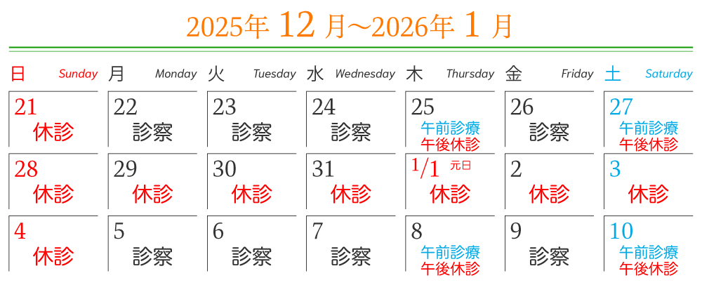 年末年始休診のお知らせ 2025年12月25日 HOME お知らせ 2025年12月28日(日)から2026年1月4日(日)まで年末年始の休診とさせていただきます。1月5日(月)から通常診療いたします。ご不便をおかけいたしますが、よろしくお願いいたします。